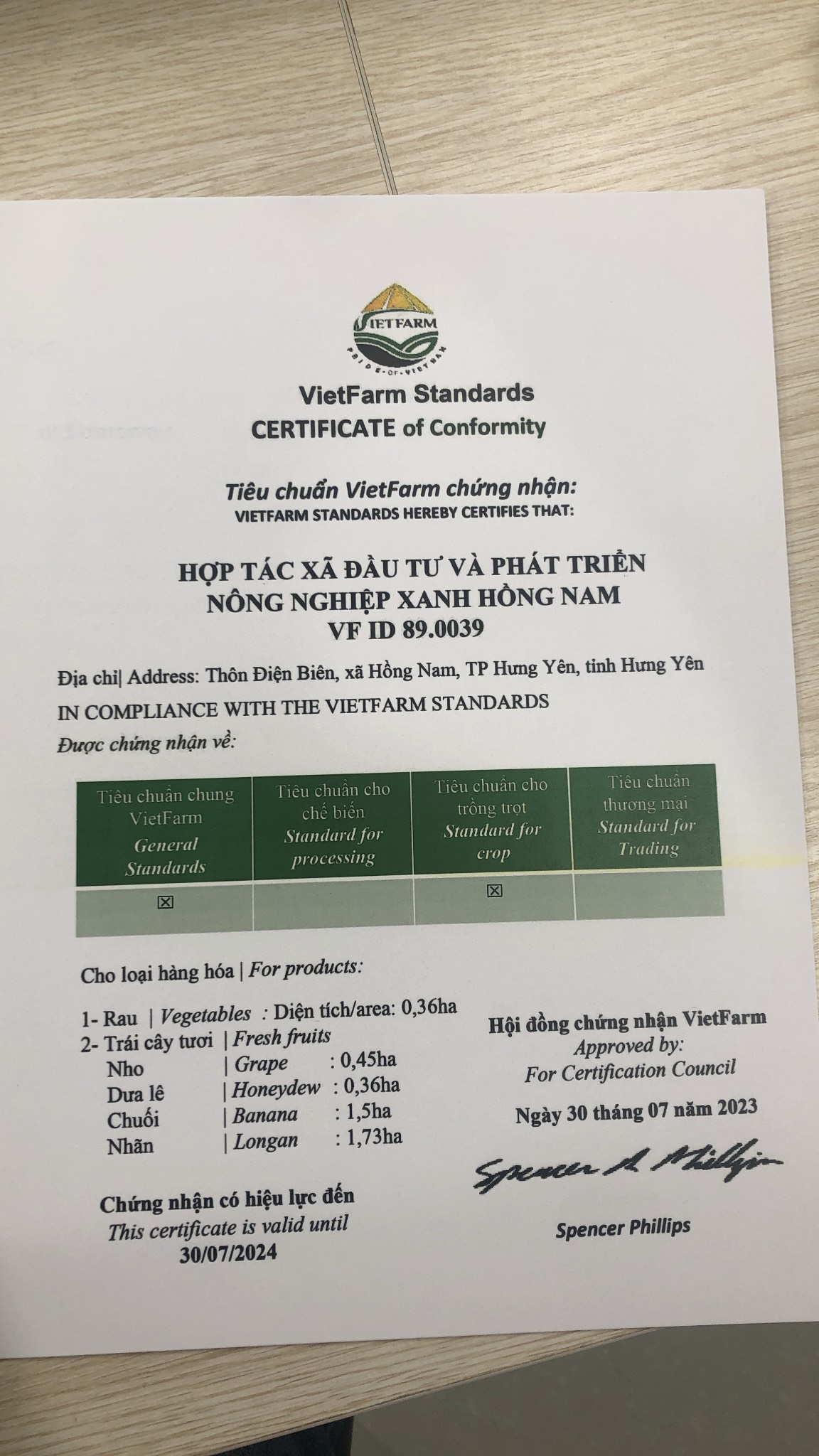 Hợp tác xã đầu tư & phát triển nông nghiệp xanh Hồng Nam : VF ID 89.0039