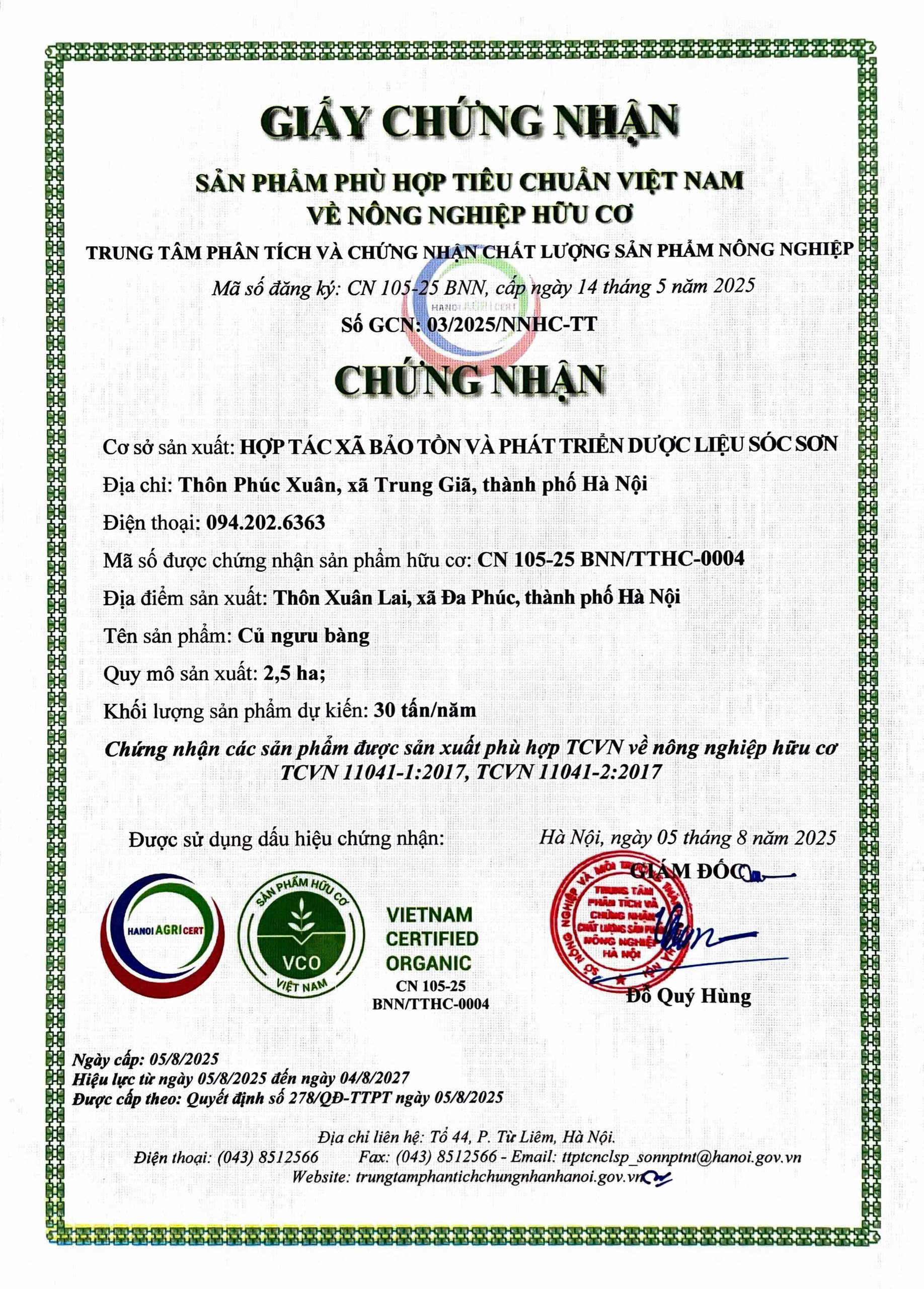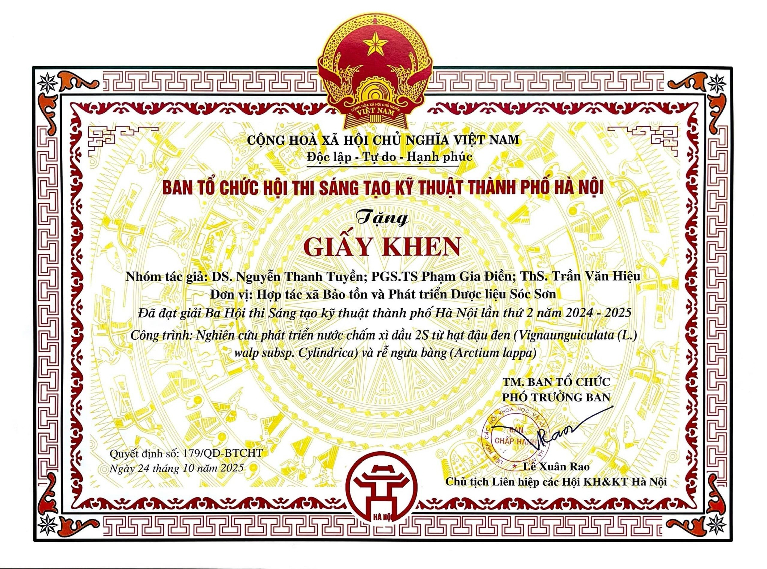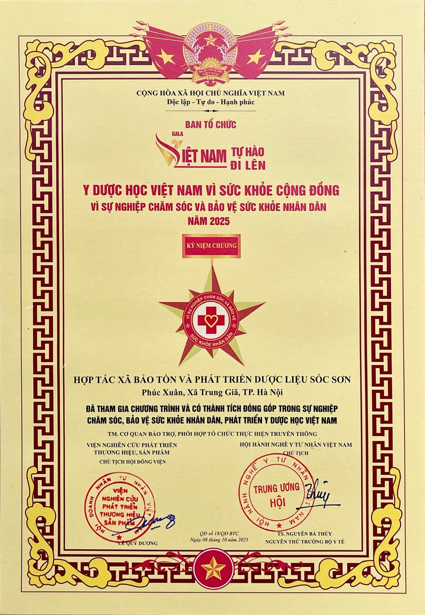 | 30-10-2025 12:10:00 | Thao tác kỹ thuật | Các giấy Chứng nhận, bằng khen, của HTX Bảo tồn và Phát triển Dược liệu Sóc Sơn. | Hoàn thành | |