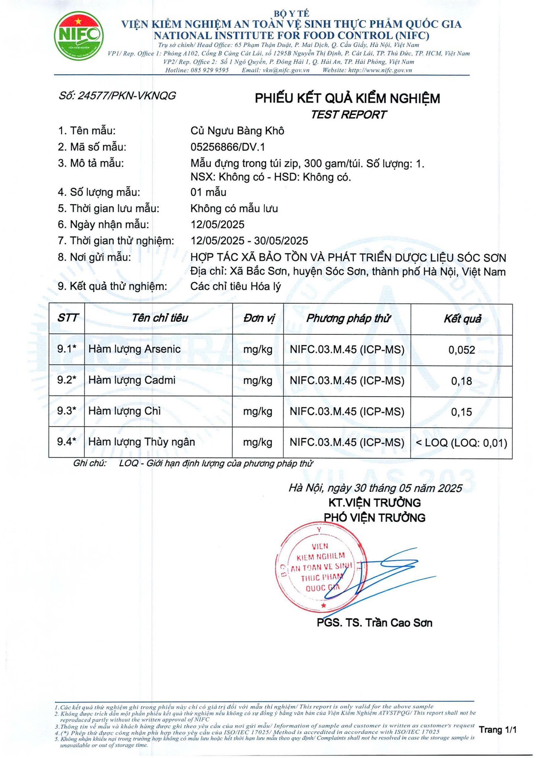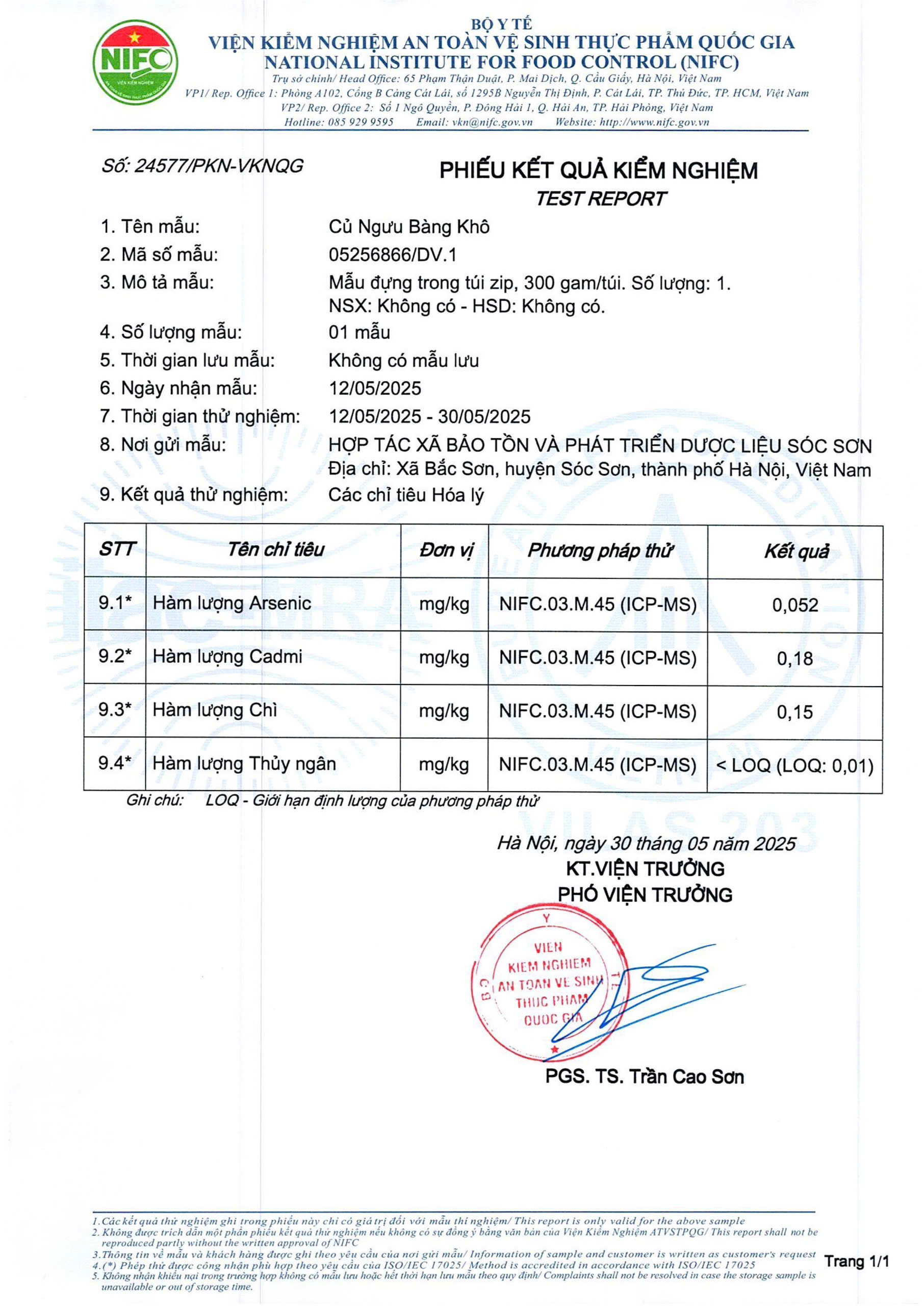 | 30-10-2025 12:10:00 | Thao tác kỹ thuật | Kết quả phân tích mẫu kiểm nghiệm củ Ngưu Bàng vụ 2024 - 2025. | Hoàn thành | |