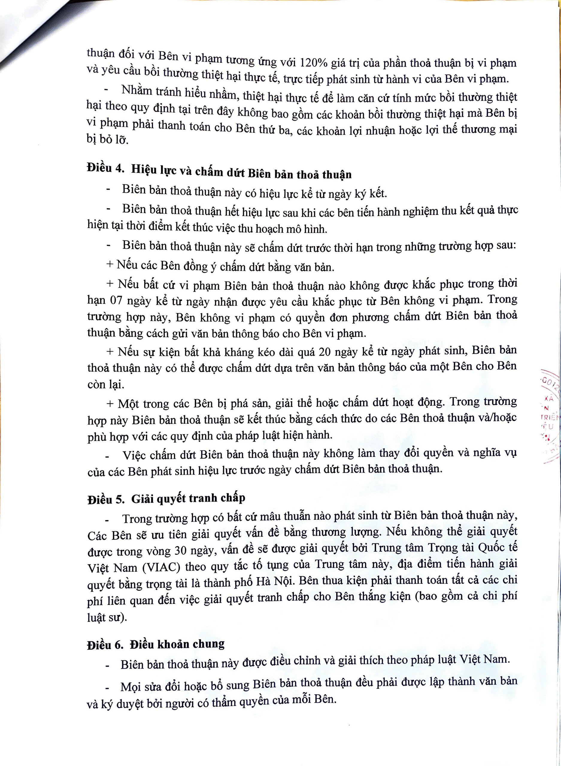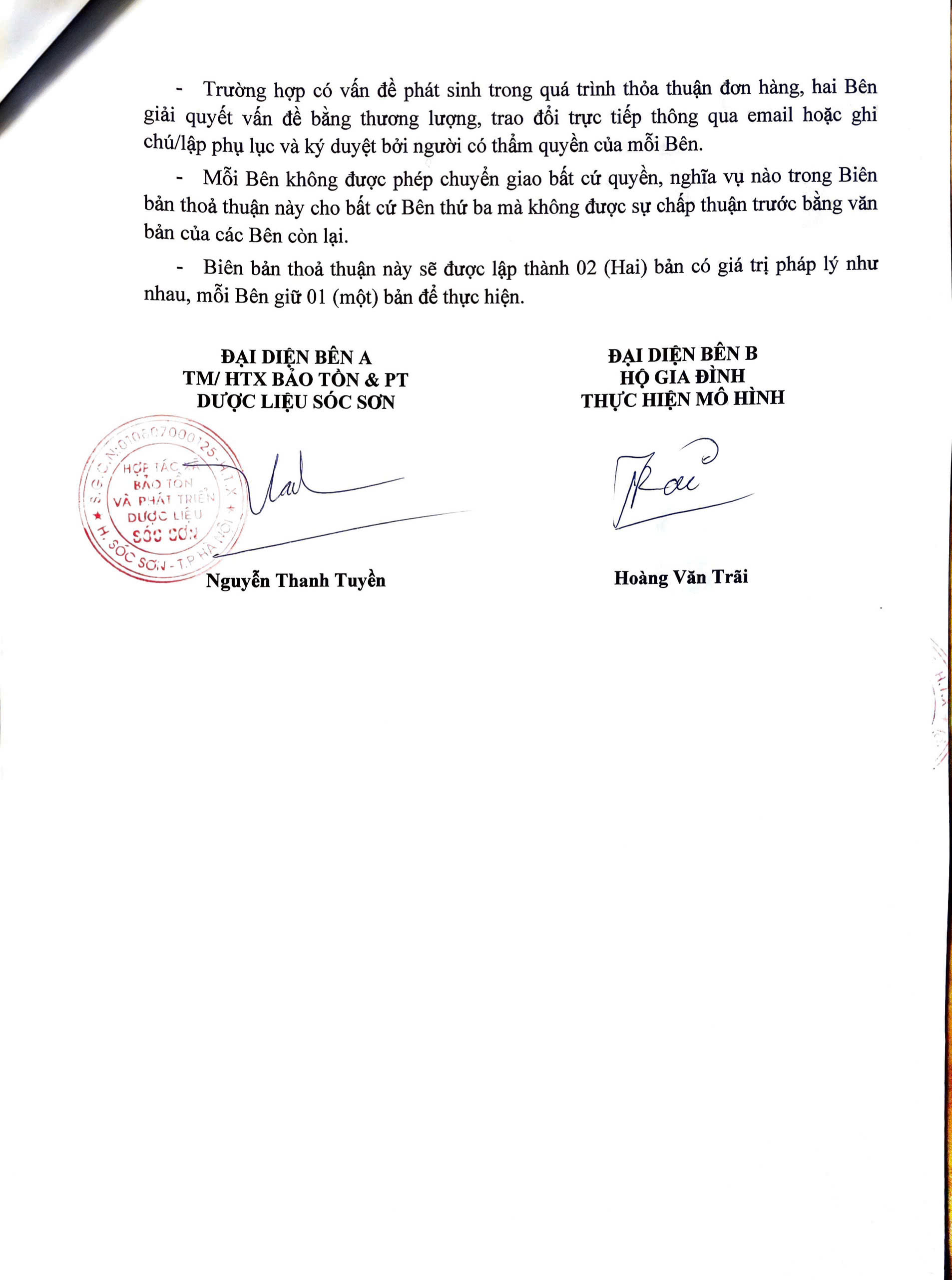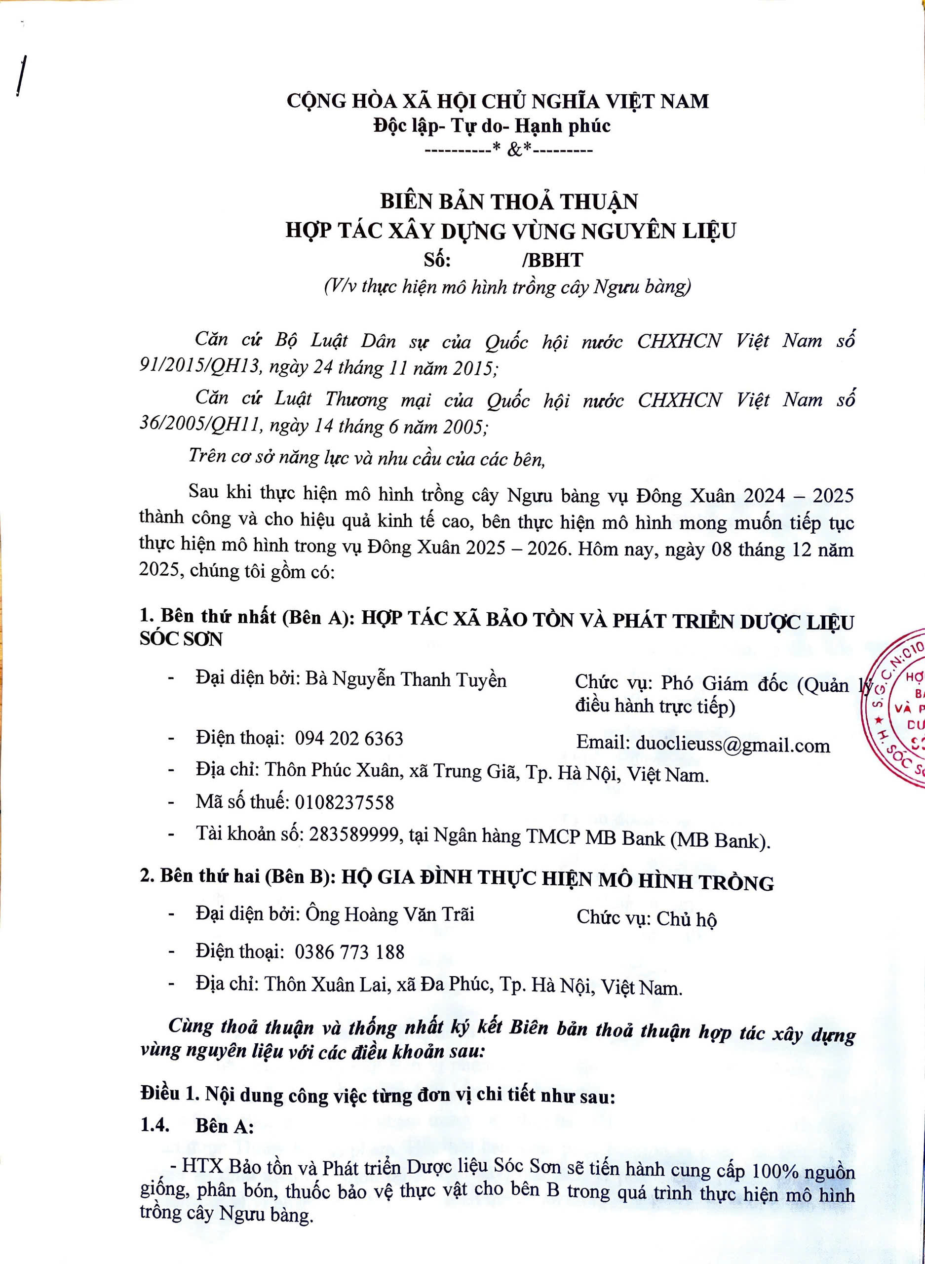 | 30-10-2025 12:10:00 | Thao tác kỹ thuật | BIÊN BẢN THỎA THUẬN HỢP TÁC XÂY DỰNG VÙNG NGUYÊN LIỆU v/v thực hiện trồng mô hình cây Ngưu Bàng 2025 - 2026 | Hoàn thành | |