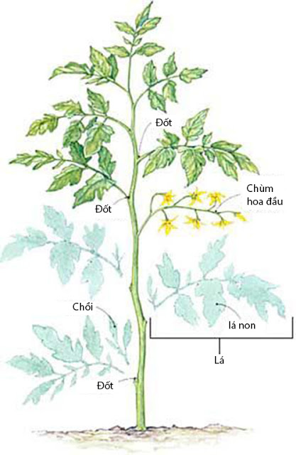 - Tỉa bỏ tất cả các chồi nhánh trên thân chính, chỉ giữ các chồi nhánh mọc dưới nách lá xuất hiện chùm hoa đầu tiên.