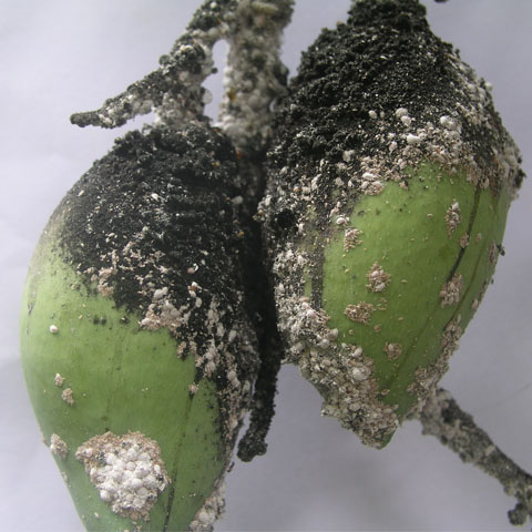 Mô tả:Bệnh làm thối đen hoa, rụng hoa, thối đen trên quả.Nấm chủ yếu gây hại chính trên các phần non của cây như chồi, lá, cành non vào giai đoạn ra lá, trên bông và trái vào giai đoạn ra bông, tạo trái