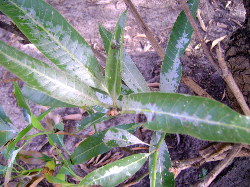 Mô tả:Do nấm Oidium mangiferae gây ra. Bệnh thường gây hại trên lá non, phát hoa, hoa và trái non. Bệnh gây hại nặng trong mùa mưa nhưng phải có nhiệt độ cao. Các phần bị nhiễm bệnh ta thấy vết bệnh có màu trắng xám hoặc trắng dơ bao phủ, bệnh thường nhiễm rất sớm trên mầm ngủ của chồi hoặc phát hoa, khi mầm phát triển bệnh cũng phát triển theo và lan sang các bộ phận khác. Đọt non bị nhiễm bệnh thường không phát triển hoặc cằn cỗi, hoa bị rụng, trái bị nhiễm nhẹ sẽ méo mó, nhạt màu đôi khi bị rụng.